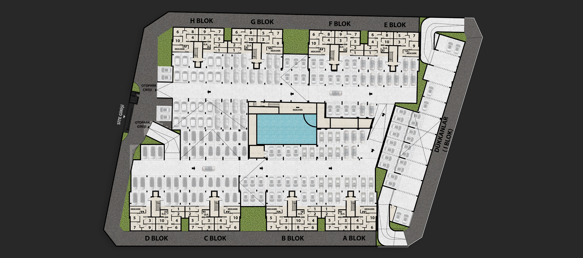 Kapalı otoparktan dairelere direkt ulaşım imkanı. Otopark sikülasyon alanı tekyönlü, ayrı giriş-çıkışlı olup, aksamamaktadır.